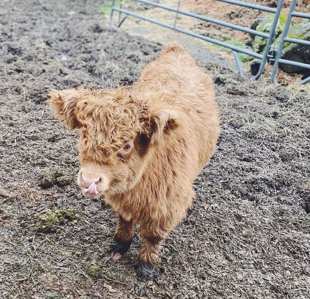 Mini Scottish Highlands have shaggy, solid-colored coats. Their colors can vary from red, black, yellow, dun, white, and silver. We have done some cross-breeding with our Highlands, also giving us a variety of spotted and tipped calves.